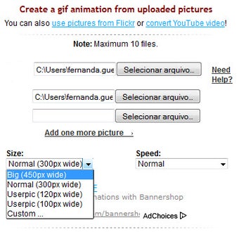 Depois, selecione um tamanho final entre as cinco opções disponíveis no Gickr – uma delas permite personalizá-lo - e escolha uma velocidade para a animação: rápida, normal, lenta, estilo slideshow (mudança de imagem a cada três segundos) ou customizada.